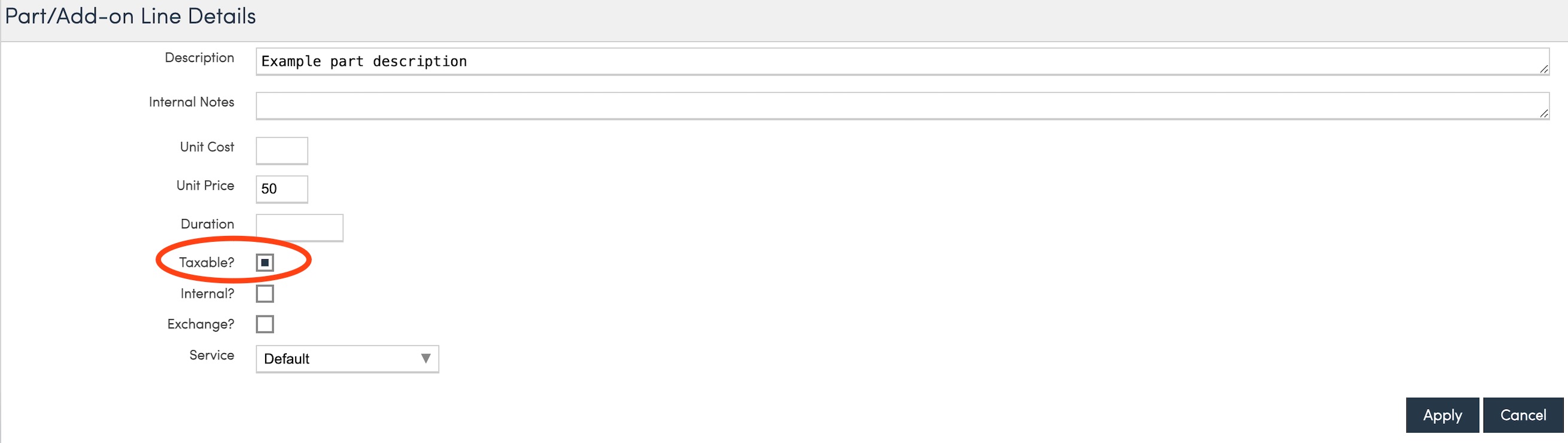 4. Check the Taxable box for Services and/or Parts/Add-Ons that need to charge tax.