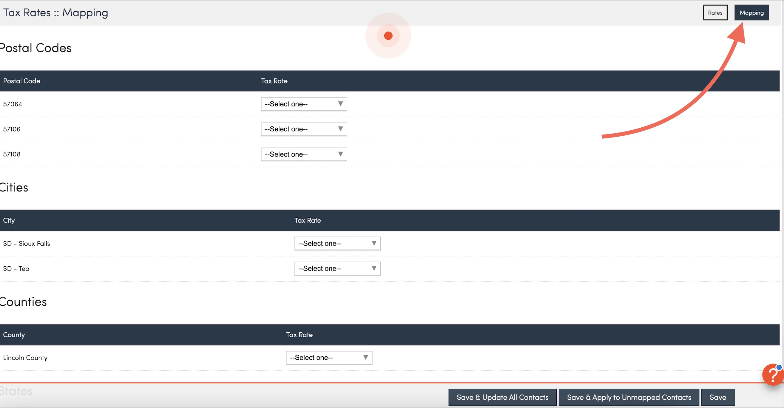 Once that is complete, you can click Save and Update All Contacts or Save and Apply to Unmapped Contacts. This will assign tax rates to your contacts automatically based on their address on file.